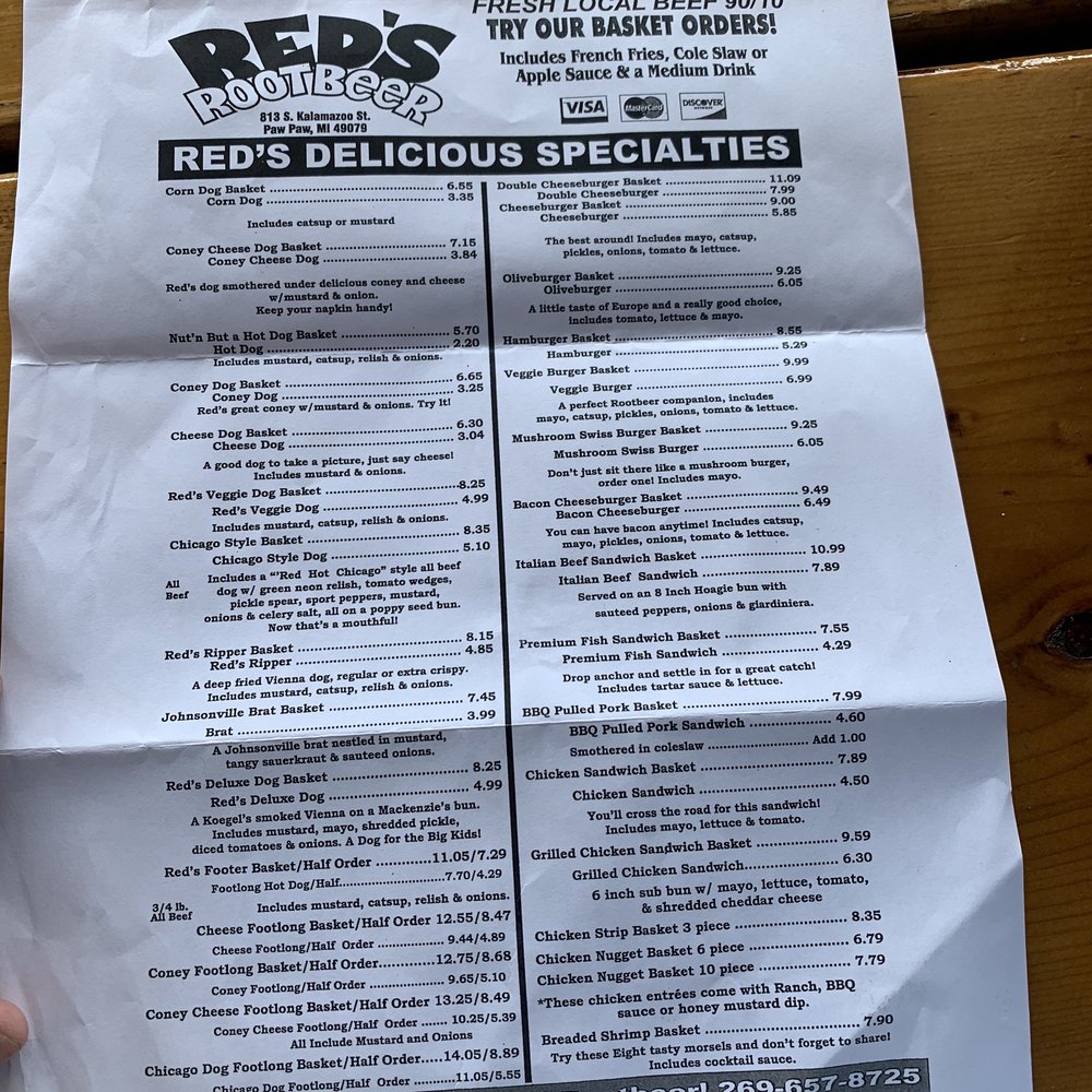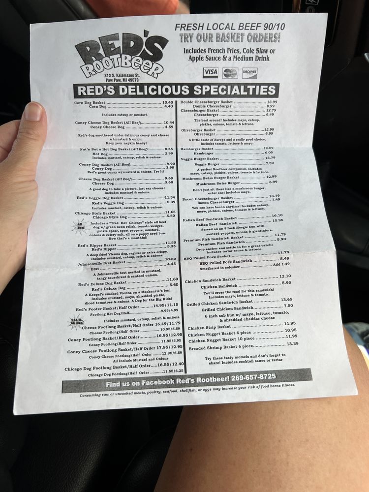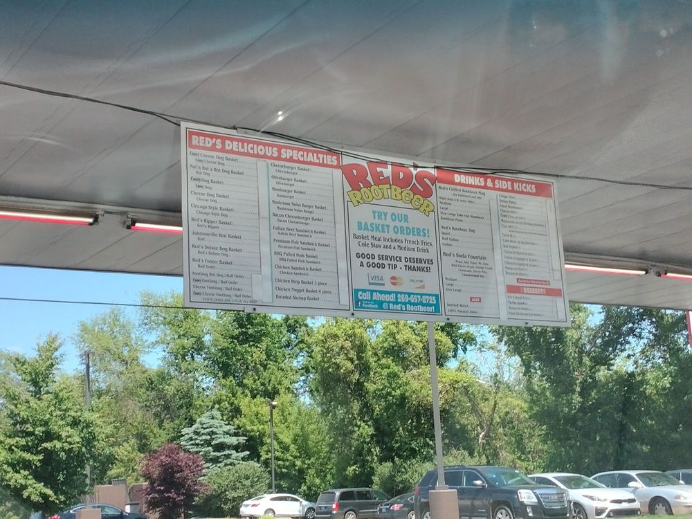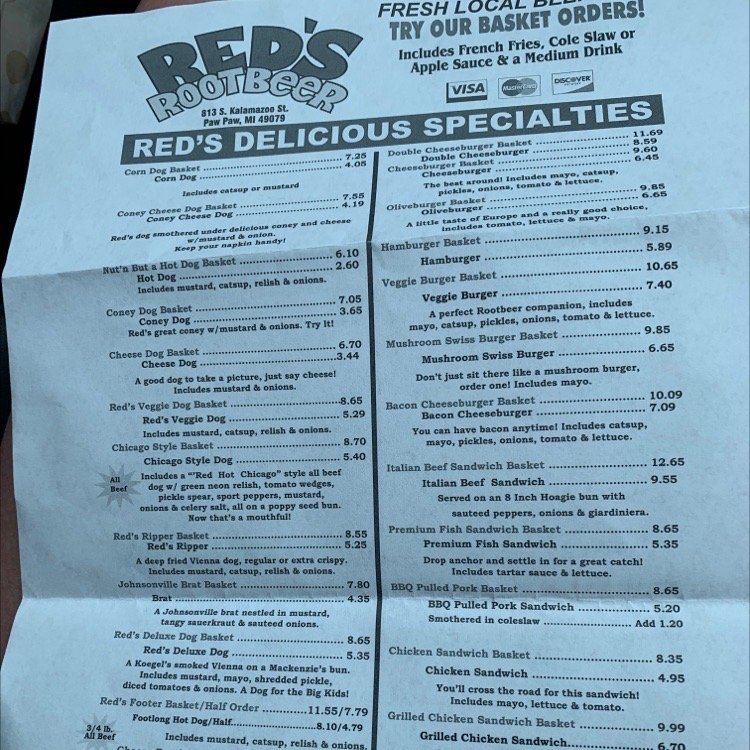 Red's Root Beer, located in Paw Paw, MI, offers a classic American drive-in experience with a focus on hot dogs, chicken tenders, and their specialty root beer served in frosty mugs. Customers rave about the friendly service, nostalgic atmosphere, and delicious food. The menu features hot dog baskets, onion rings, bacon cheeseburgers, and crinkle cut fries. The root beer is a standout highlight, praised for its taste and presentation. Outdoor seating, drive-thru service, and gender-neutral restrooms cater to a diverse range of customers. Prices are affordable, and the restaurant offers a military discount. Whether you're passing through on a road trip or a local looking for a taste of old America, Red's Root Beer promises a memorable dining experience.