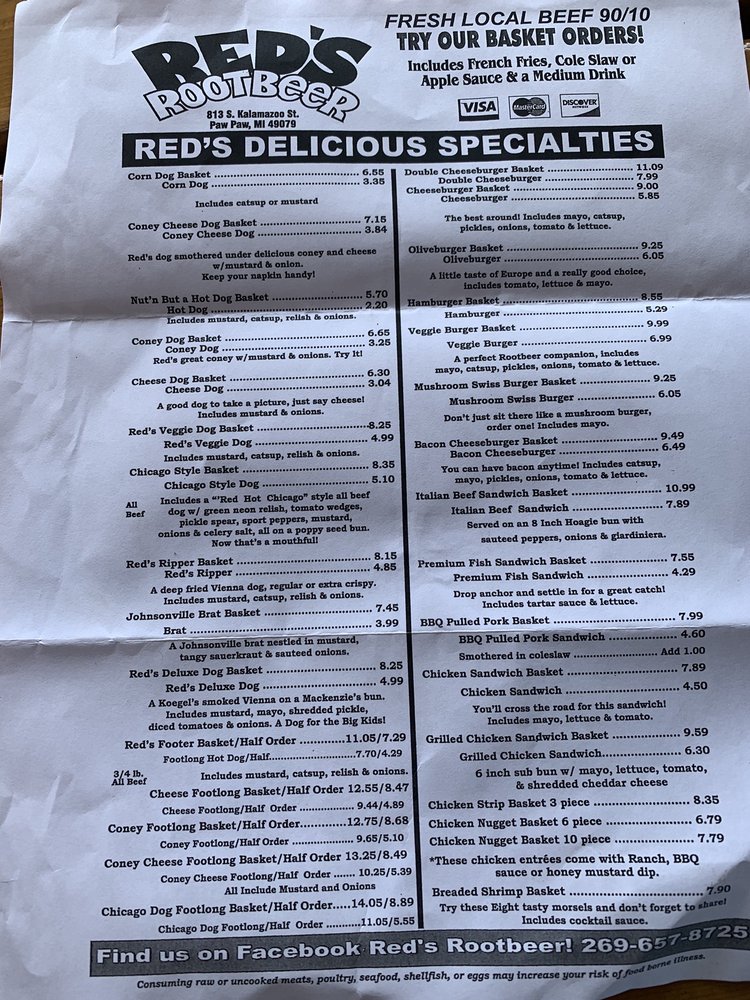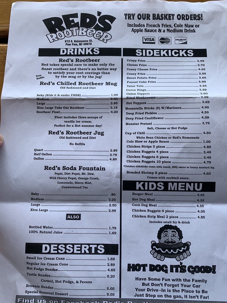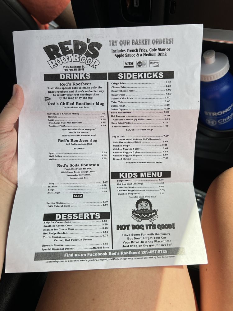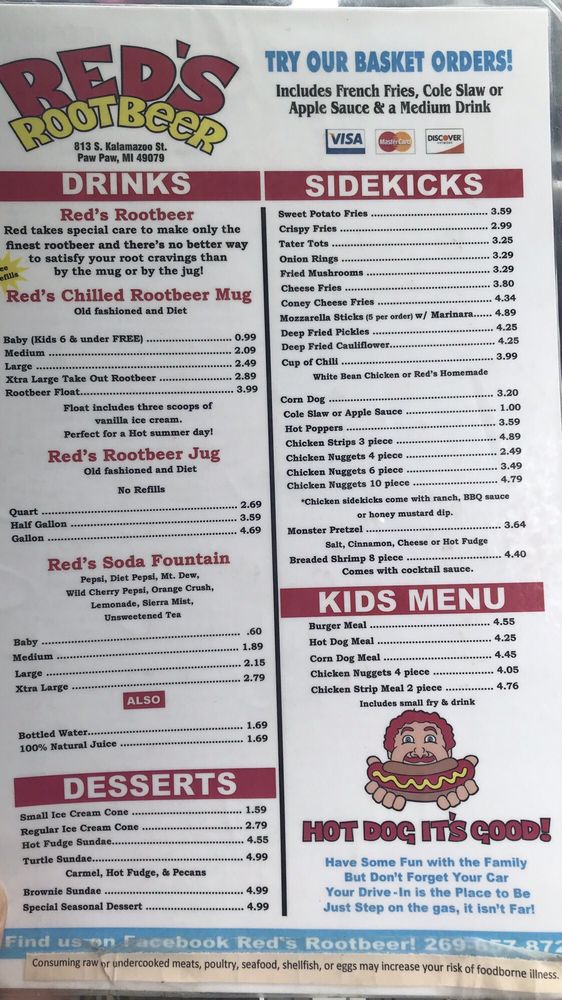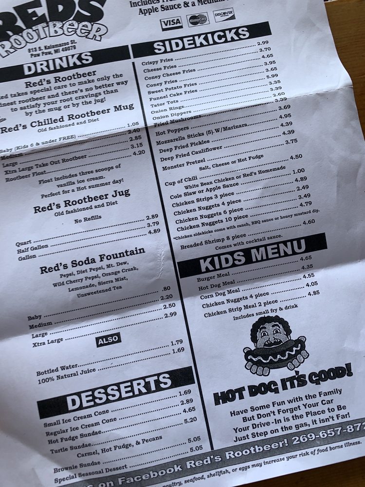 Red's Root Beer, located in Paw Paw, MI, offers a classic American drive-in experience with a focus on hot dogs, chicken tenders, and their specialty root beer served in frosty mugs. Customers rave about the friendly service, nostalgic atmosphere, and delicious food. The menu features hot dog baskets, onion rings, bacon cheeseburgers, and crinkle cut fries. The root beer is a standout highlight, praised for its taste and presentation. Outdoor seating, drive-thru service, and gender-neutral restrooms cater to a diverse range of customers. Prices are affordable, and the restaurant offers a military discount. Whether you're passing through on a road trip or a local looking for a taste of old America, Red's Root Beer promises a memorable dining experience.